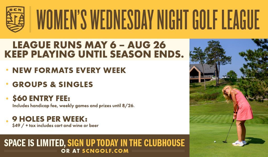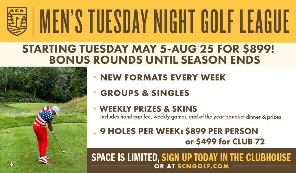 Reserve a tee time as a group or as a single to be paired up — you'll play with the same crew each week, making it a perfect way to bond with friends. Each night, points are earned based on the leaderboard, building toward a year-long individual points race. Enjoy a variety of formats weekly, including team events, plus gross and net divisions. Hole contests will also add extra points and pro shop credit throughout the season. See you on the course!